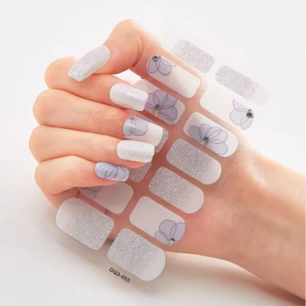 Celoplošné krycie nálepky na nechty, svetlozelené s kvetmi a glitrami.